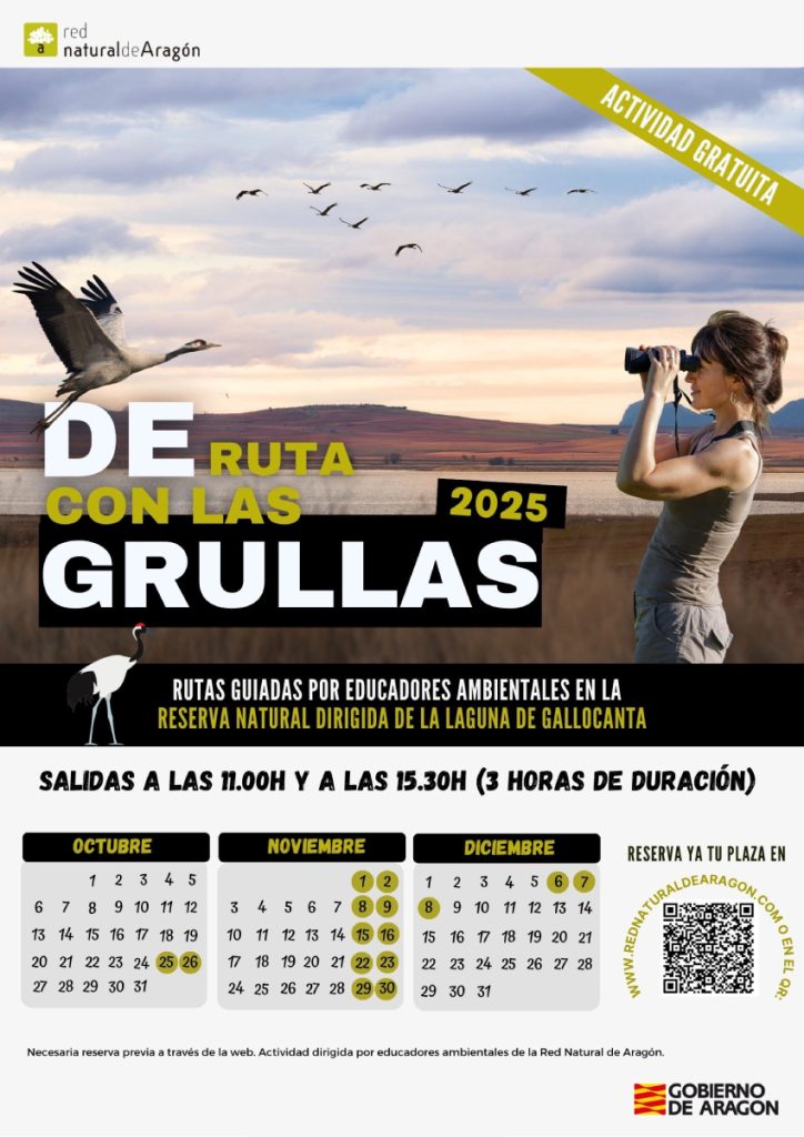 Una experiencia gratuita, dirigida por una educadora ambiental, en la que el visitante puede descubrir las curiosidades de la especie, sus hábitos, su morfología o sus modelos migratorios al tiempo que observa a las grullas en su hábitat natural. La actividad De ruta con las grullas dará comienzo a partir del 25 de octubre y se prolongará hasta primeros de diciembre.