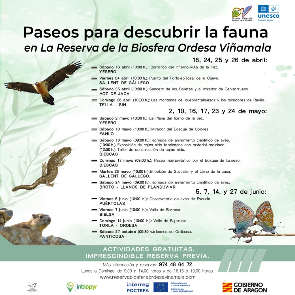 La Reserva de la Biosfera Ordesa Viñamala, a través del proyecto INBIOPYR, organiza una serie de paseos guiados durante los meses de mayo y junio para descubrir la fauna de este territorio. En total son 14 rutas para conocer aves, mamíferos, anfibios, reptiles o mariposas e incluso jornadas de anillamiento de aves para disfrutar en todos los municipios que forman parte de la Reserva Biosfera.