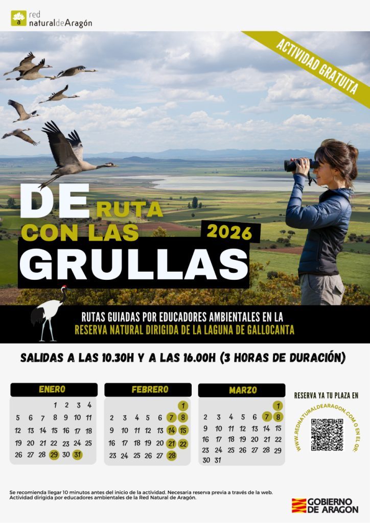 El Centro de Interpretación de la Reserva Natural Dirigida de la Laguna de Gallocanta pone en marcha desde este próximo 29 de enero sus populares ‘Rutas con las grullas’. Estas visitas, que se llevan a cabo todos los fines de semana y festivos hasta el mes de marzo, permiten al visitante recorrer el entorno de la laguna para presenciar uno de los espectáculos naturales más bellos de nuestra Comunidad: la migración de la grulla común.