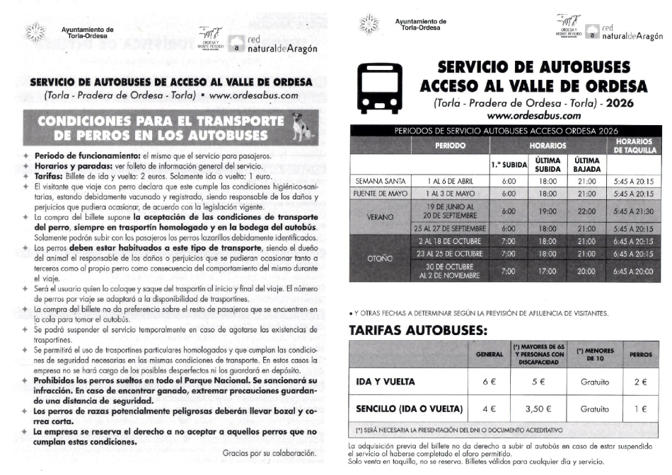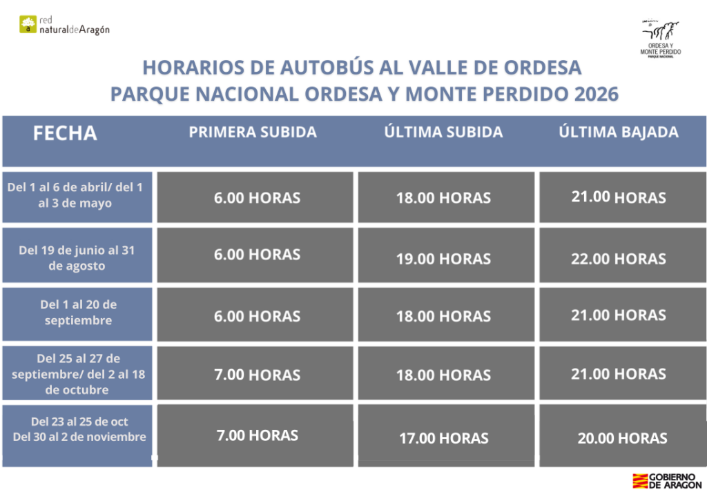 Para 2026, el servicio de autobús al valle de Ordesa (pradera de Ordesa) se habilitará en las siguientes fechas y horarios: