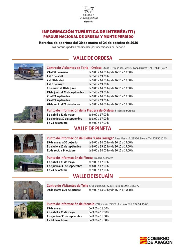 Consulta aquí la información oficial de las líneas de autobús al valle de Ordesa y los horarios de los Centros de Interpretación y puntos de atención al visitante del Parque Nacional de Ordesa y Monte Perdido para 2026.