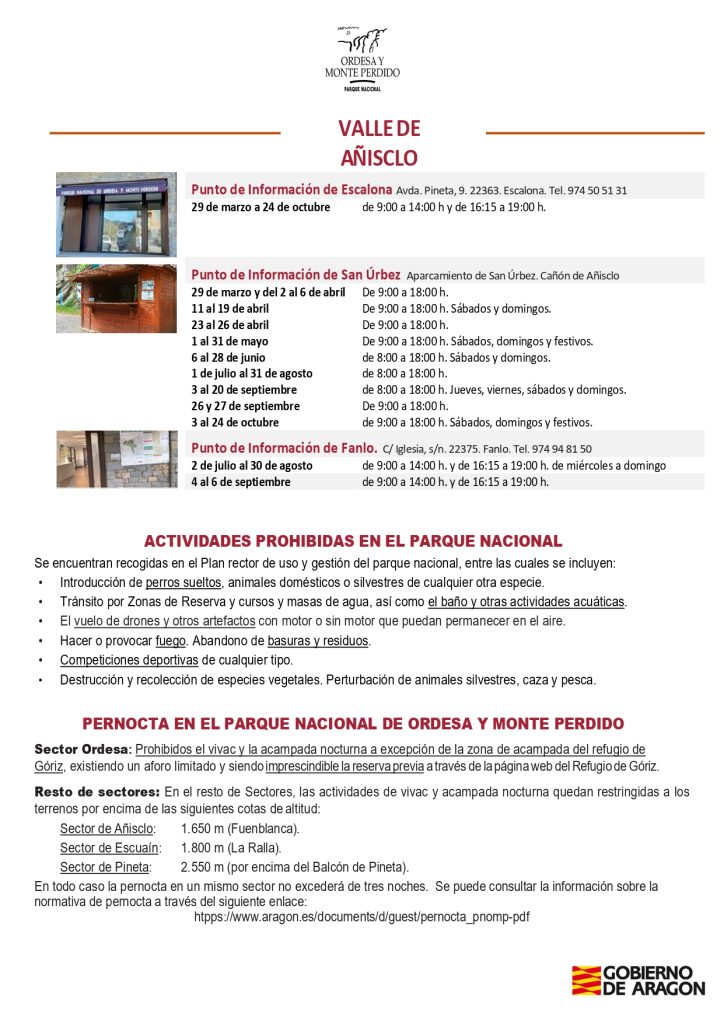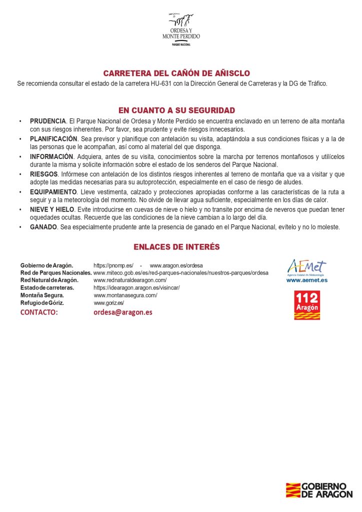 La capacidad máxima del Valle de Ordesa es de 1.800 personas simultáneas. El servicio de transporte público se suspenderá cuando se alcance este número, por razones de conservación del Parque Nacional.