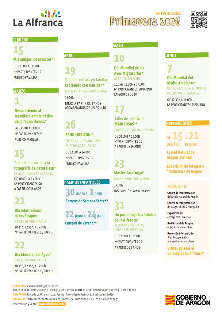 La Alfranca acaba de presentan su programación de actividades para esta primavera 2026 con más de una veintena de propuestas para todos los públicos. La oferta, promovida por la Dirección General de Educación Ambiental del Gobierno de Aragón, incluye actividades divulgativas en la naturaleza, talleres, campus infantiles y exposiciones.